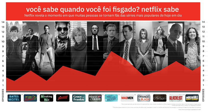 A empresa tem tantos dados em tempo real, que consegue saber exatamente o que prende sua atenção, como podemos ver na imagem abaixo, que indica em qual episódio de cada série, as pessoas ficaram viciadas: